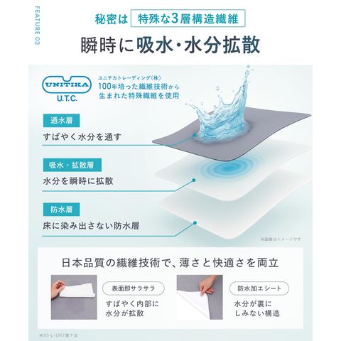 ●ポリエステル、綿、ポリウレタンの特殊な3層構造で水分を吸水します。