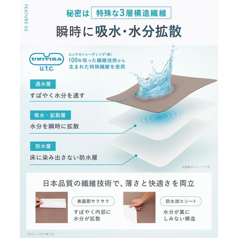 ●ポリエステル、綿、ポリウレタンの特殊な3層構造で水分を吸水します。