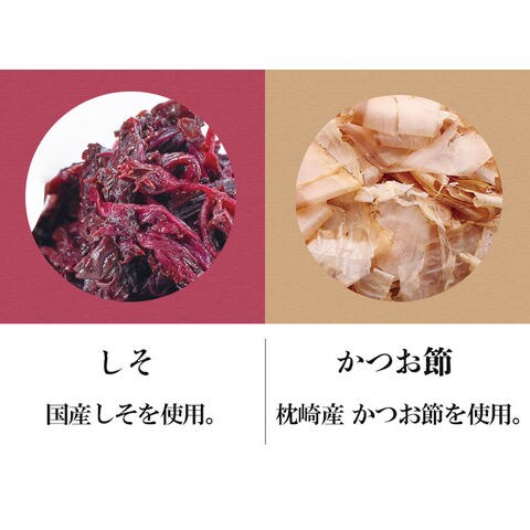 | 原材料名 | 梅、鰹削り節、しそ、山椒、漬け原材料(高果糖液糖、還元水飴、食塩、はちみつ、醸造酢)/調味料(アミノ酸等)、トウガラシ抽出物、野菜色素、ビタミンB1 | ||