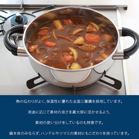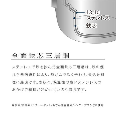 材質: 本体=18-10ステンレス・鉄芯・18-10ステンレス(全面鉄芯三層鋼)