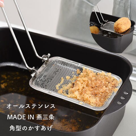 四角いカタチのスクエア型の揚げ物鍋にフィットするようにと作られたオールステンレスの角型のかす揚げです。