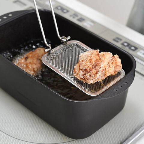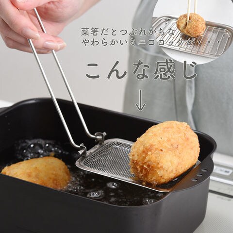 四角いから、揚げ鍋のカタチにフィットして、しっかりかすをすくえる優れものです。