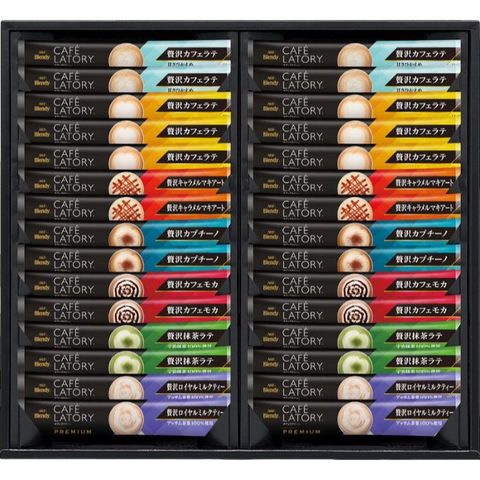 贅沢カフェラテ(18g)×6、贅沢抹茶ラテ(19.2g)・贅沢ロイヤルミルクティー(19g)・贅沢カフェモカ・贅沢カプチーノ・贅沢キャラメルマキアート・贅沢カフェラテ甘さひかえめ(各18g)×各4