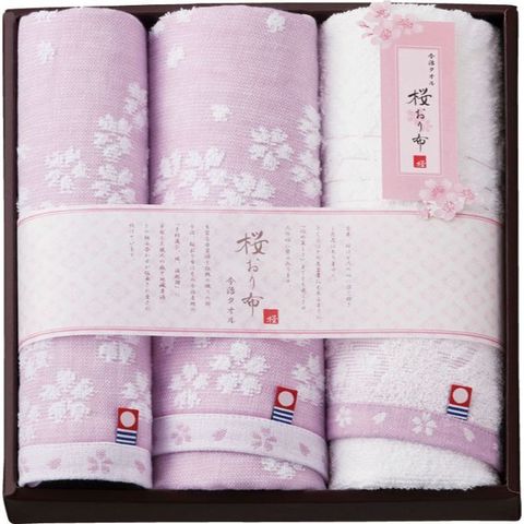 古来、桜ほど日本人の心に深く根ざした花はありません。平安時代以後の日本では単に「花」と言えば桜の事を指す花の代名詞にもなっています。それほど日本では長い間、愛されてきた桜。桜は、その花言葉にもあるように「心の美しさ」までをも感じさせ、小さな花がたくさん集まり、ほのかな淡いピンクのグラデーションに色づく光景は、日本人の心に染み入ります。そんな桜をモチーフにした『今治タオル 桜おり布』は、桜と同様、長く愛され続けているシリーズです。タオルだけでなく、商品のパッケージにも桜のモチーフをあしらっています。