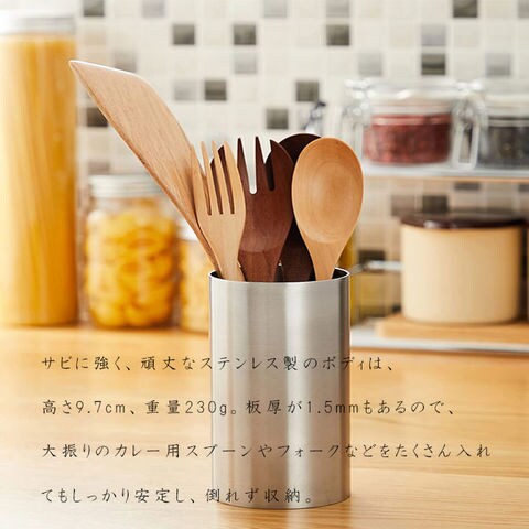 板厚が1.5mmもあるので、ズッシリとした重量があり、大振りのカレー用スプーンやフォークなどをたくさん入れても倒れず、安定感があります。