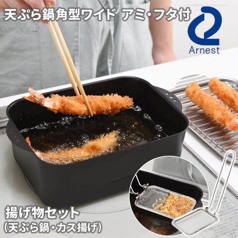 【2点セット】アーネスト 天ぷら鍋角型ワイド アミ・フタ付 A-77698 & 折りたたみ かす揚げ スクエア A-77744