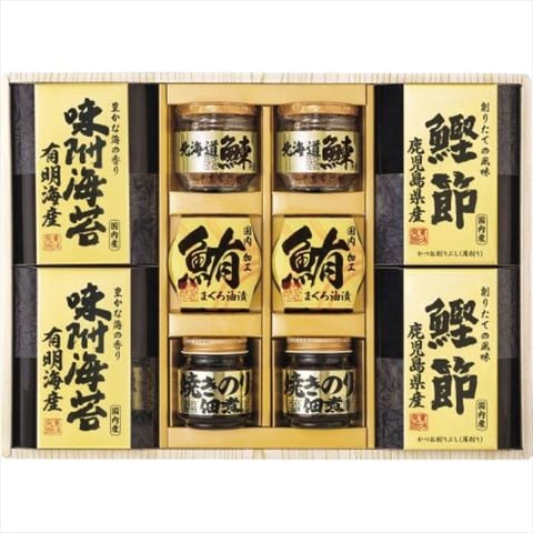 焼きのり入佃煮(85g)・まぐろ油漬け(70g)・北海道産鰊フレーク(50g)・鹿児島県産鰹節(2g×3)・有明海産味附海苔(8切10枚入)×各2