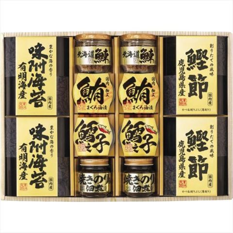 北海道産の鮭フレーク、小豆島で製造された焼き海苔入りの佃煮、鹿児島県産鰹節など選りすぐりの逸品を詰合せた和風ギフトです。