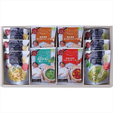 粉末パスタソース(ジェノベーゼ・ペペロンチーノ)×各3、オニオンスープ×2、ミネストローネ・緑色野菜の塩スープ×各1