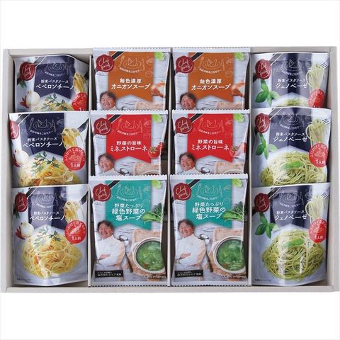 粉末パスタソース(ジェノベーゼ・ペペロンチーノ)×各3、オニオンスープ・ミネストローネ・緑色野菜の塩スープ×各2