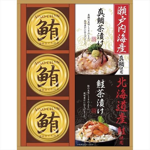 鮪油漬フレーク(70g)×3、瀬戸内海産真鯛茶漬け(5.1g×3袋)・北海道産鮭茶漬け(4g×3袋)×各1
