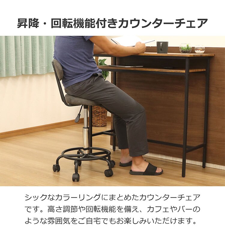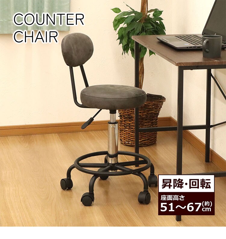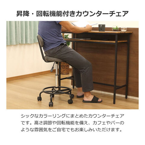 シックなカラーリングにまとめた、背ありの昇降機能・回転機能付きカウンターチェアです。