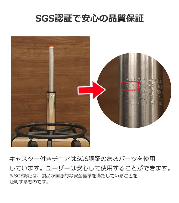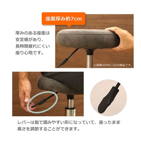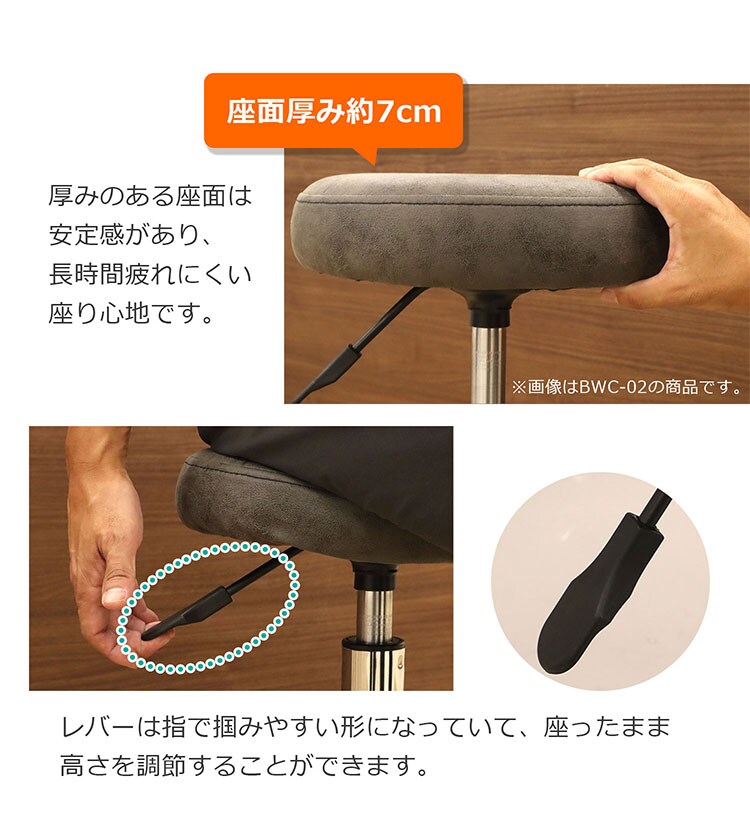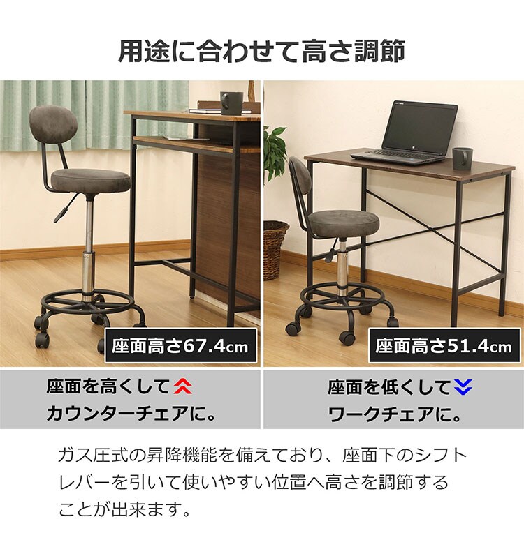 ・ガス圧式の昇降機能を備えており、座面下のシフトレバーを引いて使いやすい位置へ高さを調節することが出来ます。