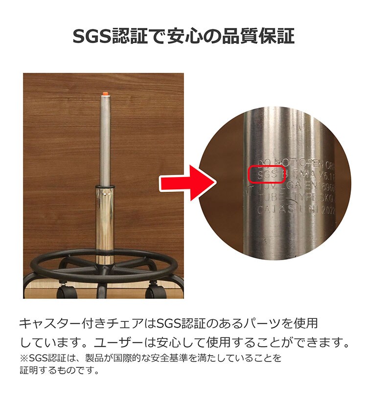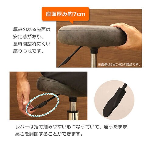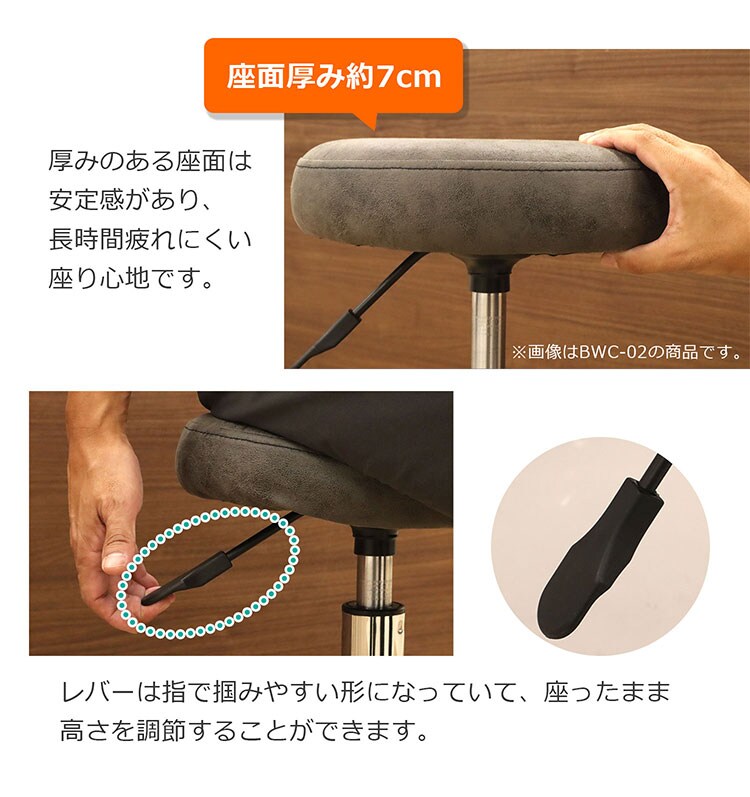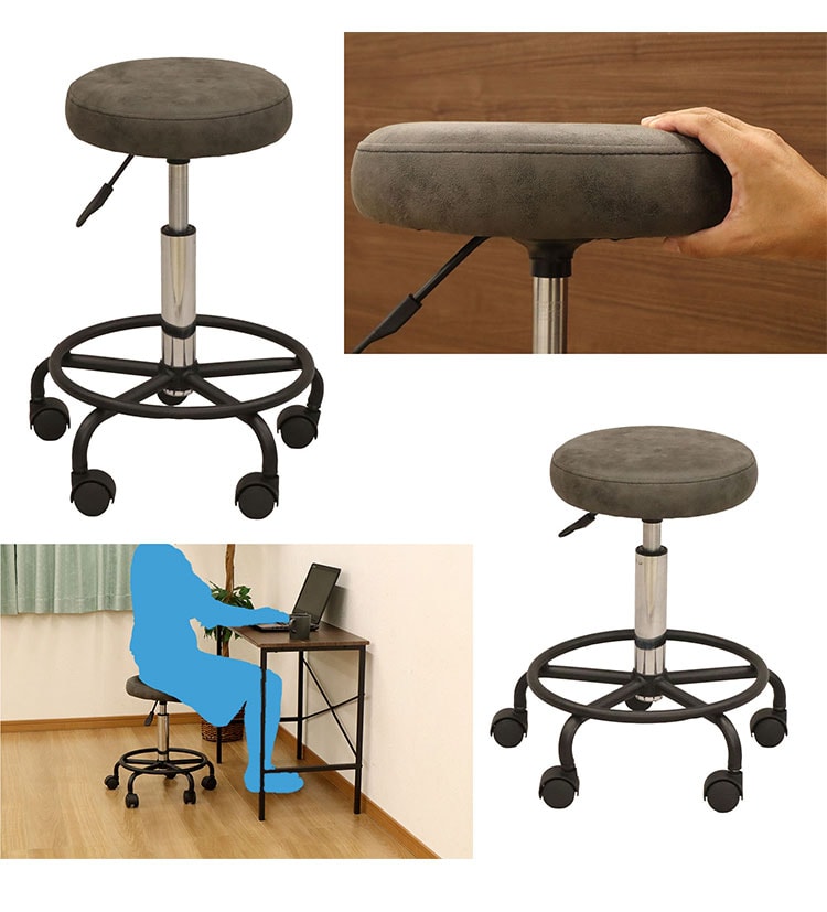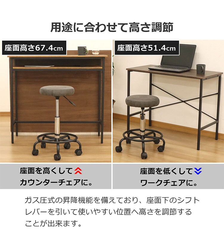 ・ガス圧式の昇降機能を備えており、座面下のシフトレバーを引いて使いやすい位置へ高さを調節することが出来ます。