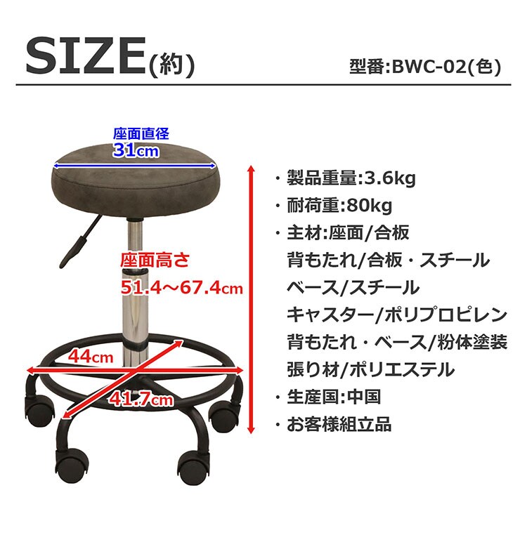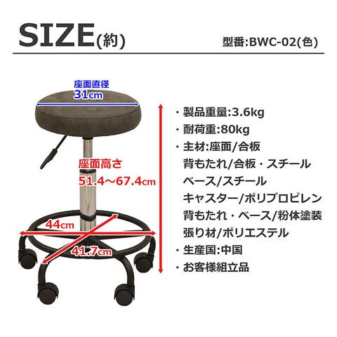 ・主材:座面/合板、ベース/スチール、キャスター/ポリプロピレン、ベース/粉体塗装、張り材/ポリエステル