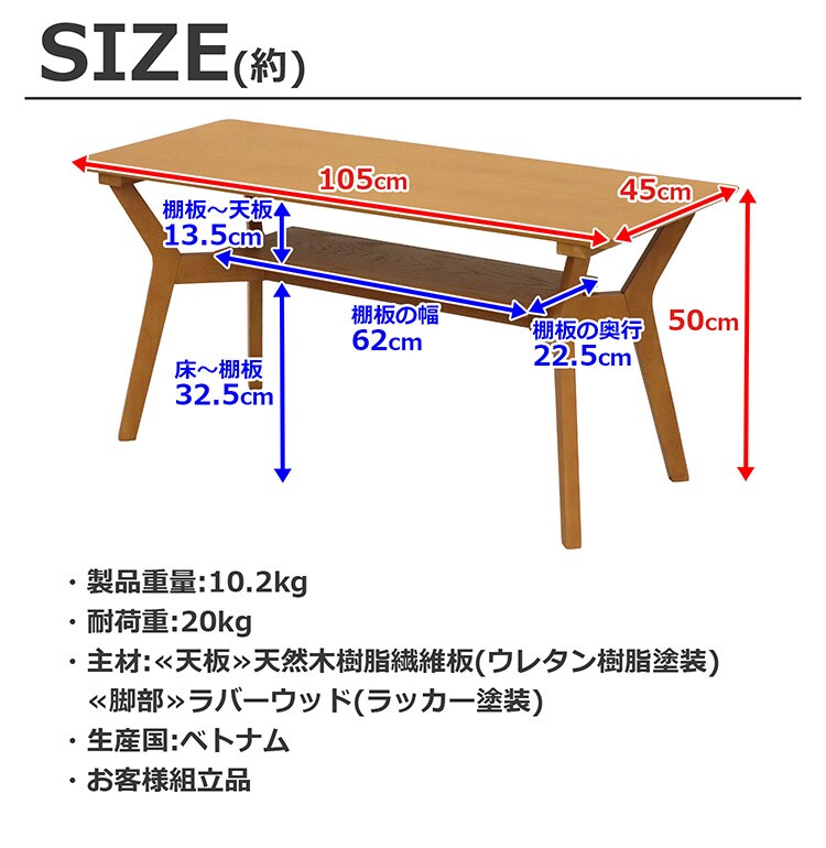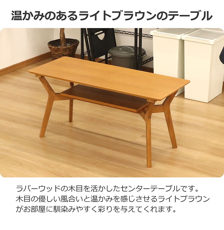 リビングテーブル 幅105 ラバーウッド 木目 センターテーブル ライトブラウン 幅105cm 2~4人掛け 高さ50cm ロータイプ テーブル ソファ 棚板 ウレタン塗装 テーパー仕様 リビング 座卓 作業台 組立品【送料無料】
