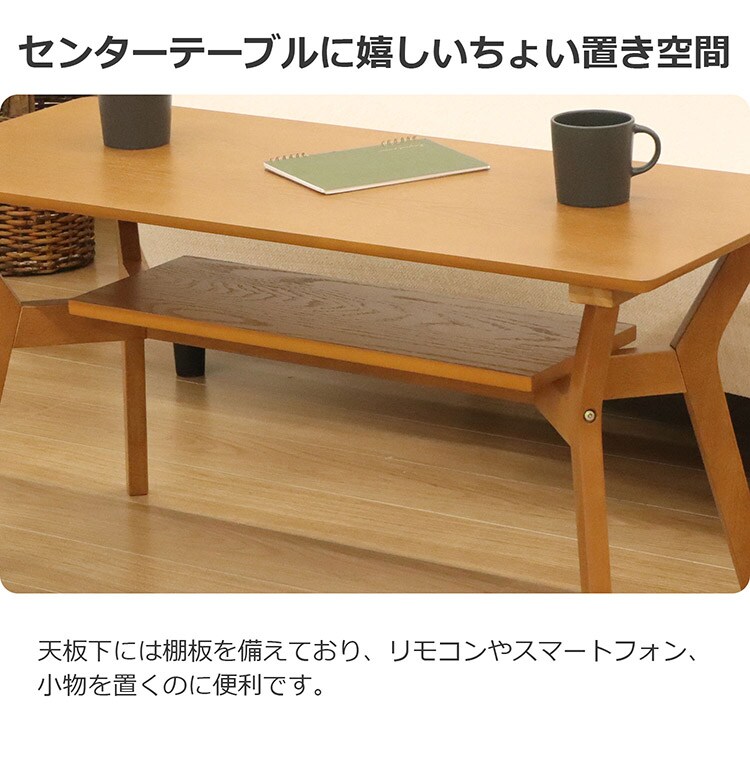 天板下には棚板を備えており、リモコンやスマートフォン、小物を置くのに便利です。