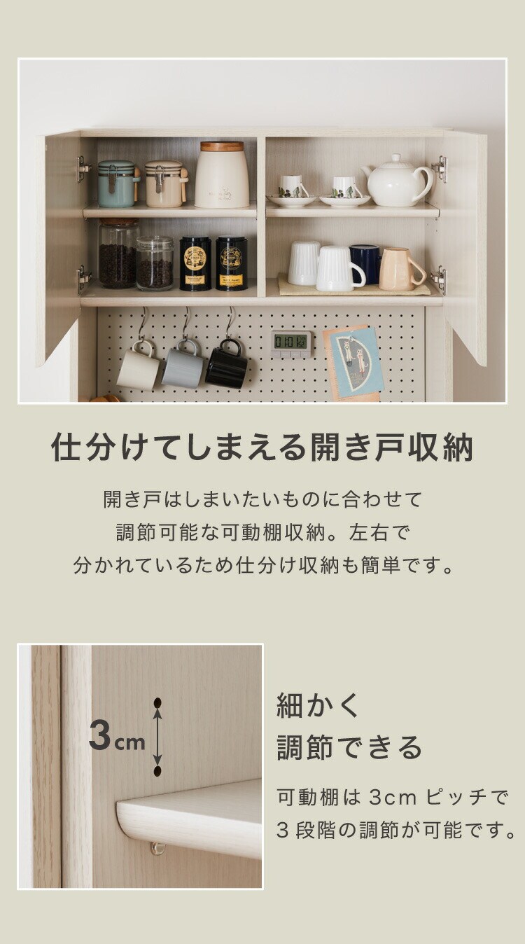 開き戸内は高さを調節できる可動棚付き。食器や小物をスッキリ収納することができます。