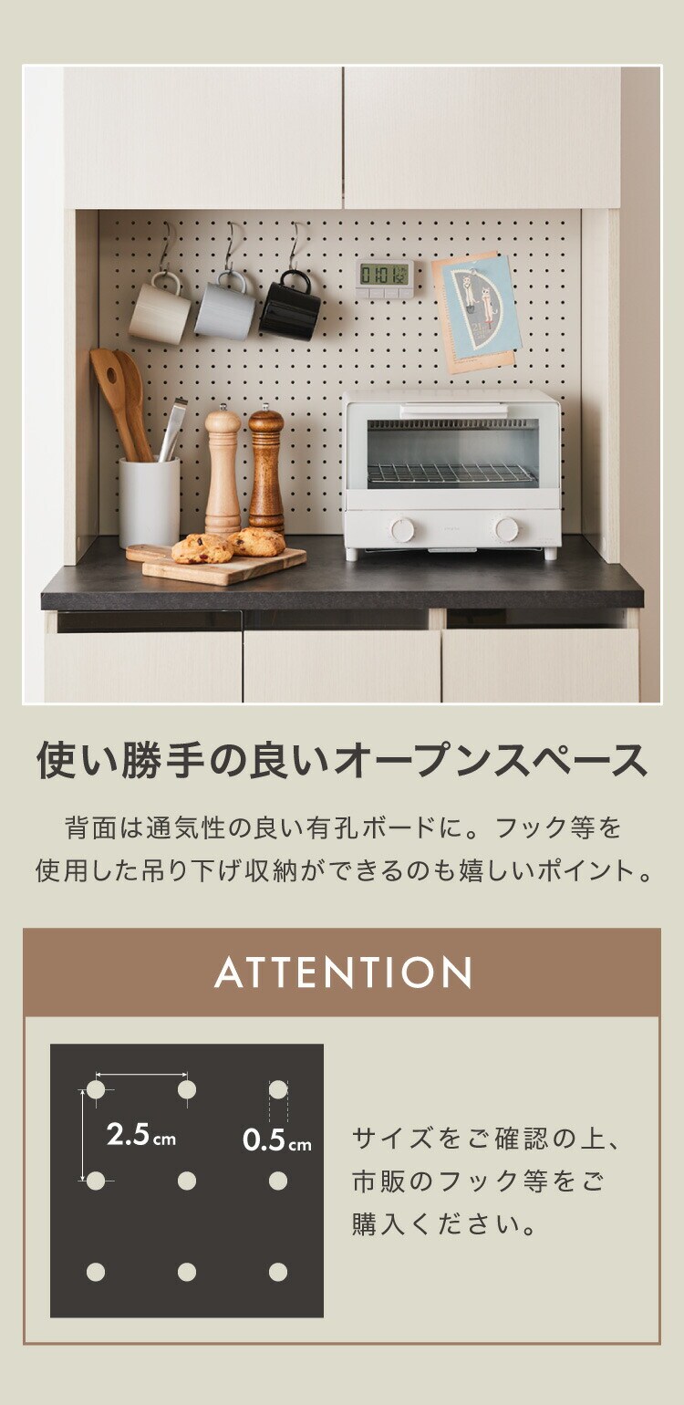 オープンスペースの背面は、有孔ボードを使用。通気性が良く、フックを使用してキッチンツールを吊り下げるのも◎。スチール製なので磁石もくっつきます。