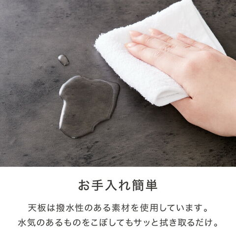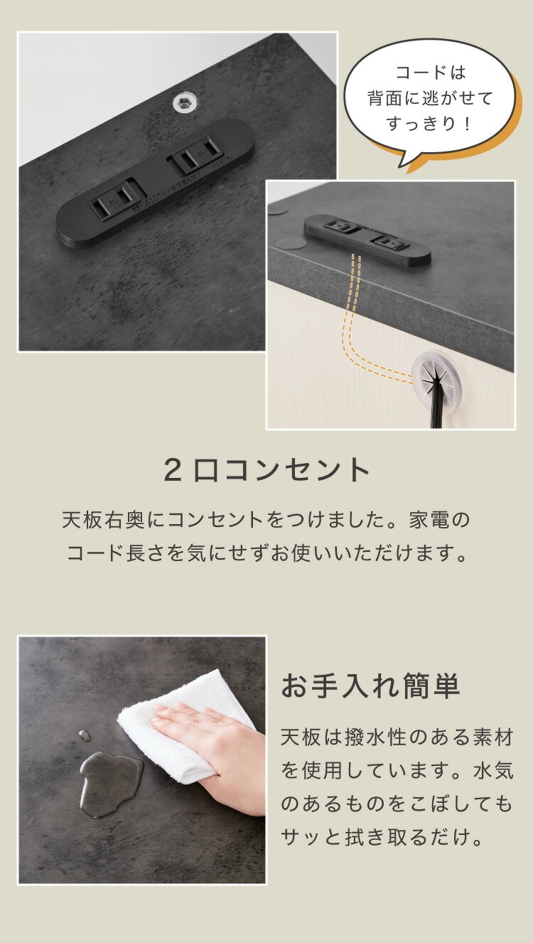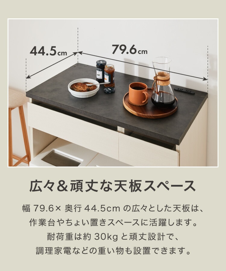 幅79.6×奥行44.5cm(約)の広々とした天板。耐荷重約30kgなので、調理家電なども設置可能。天板右奥に2口コンセント、背面側に配線孔が付いています。