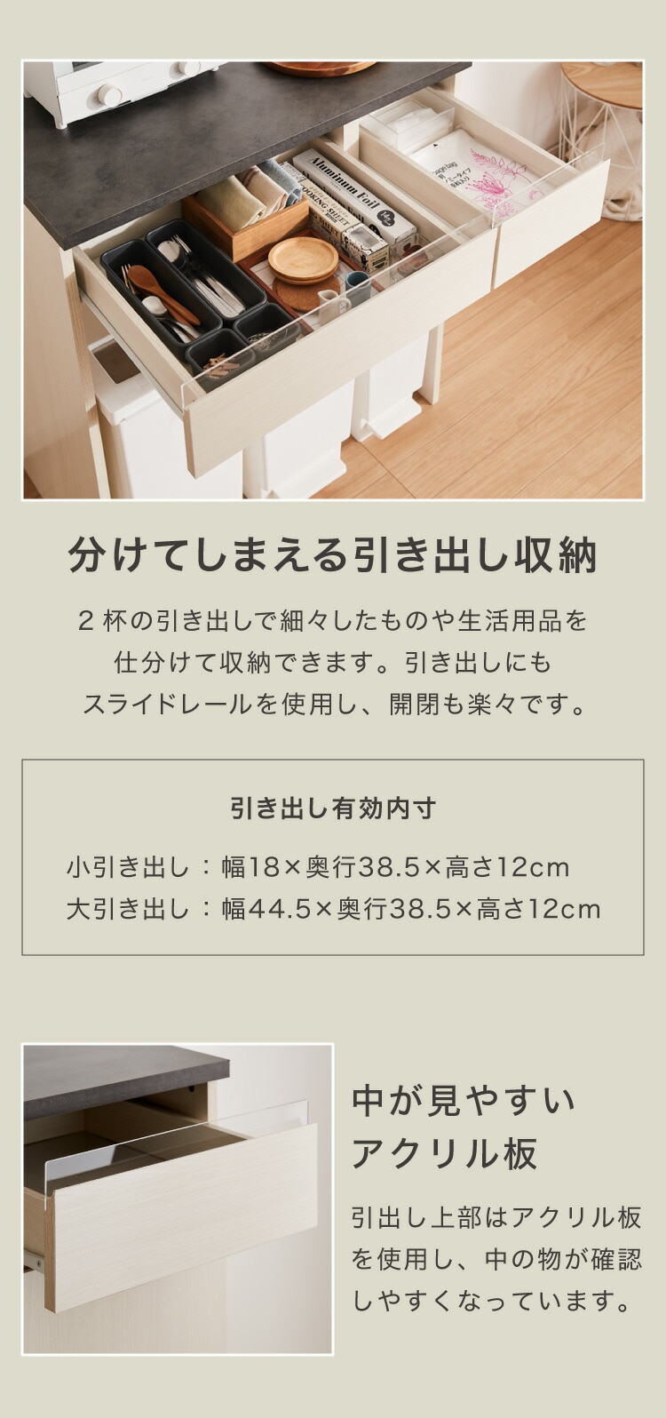 カトラリーなどキッチン小物を収納するのに丁度良い引出しが2杯付き。