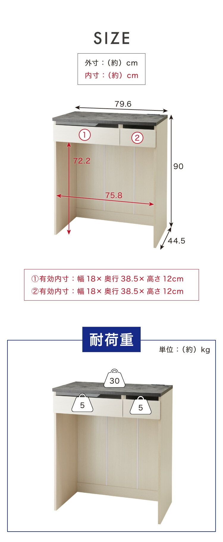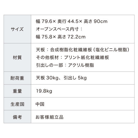 耐荷重(約):天板30kg、引出し5kg/1杯