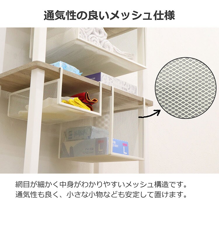 網目が細かく、中身がわかりやすいメッシュ仕様。通気性も良く、小さな小物なども安定して置けます。