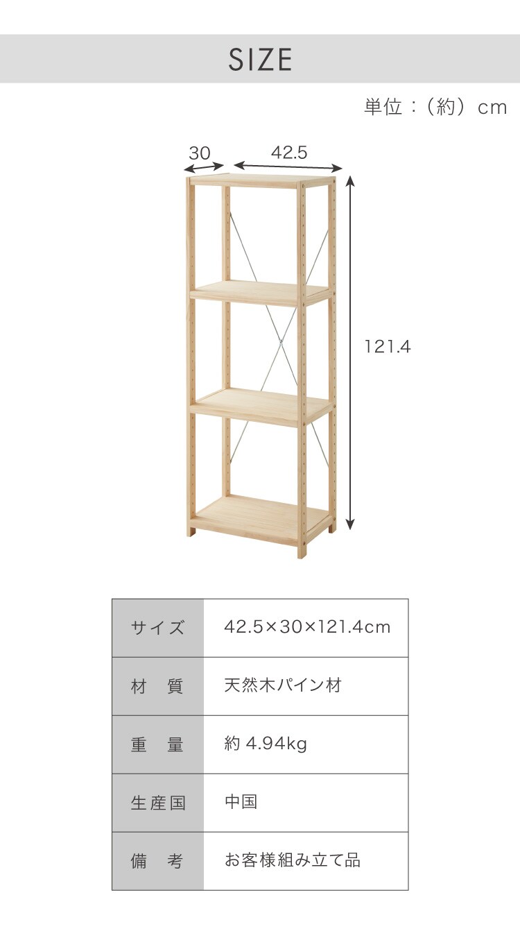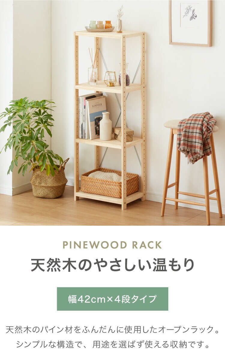 天然木 パインラック 4段 幅42.5 オープンラック 三段 おしゃれ 木目 木製 収納 パイン材 シェルフ 奥行き30 高さ121.4 北欧 ラック 木目調【送料無料】