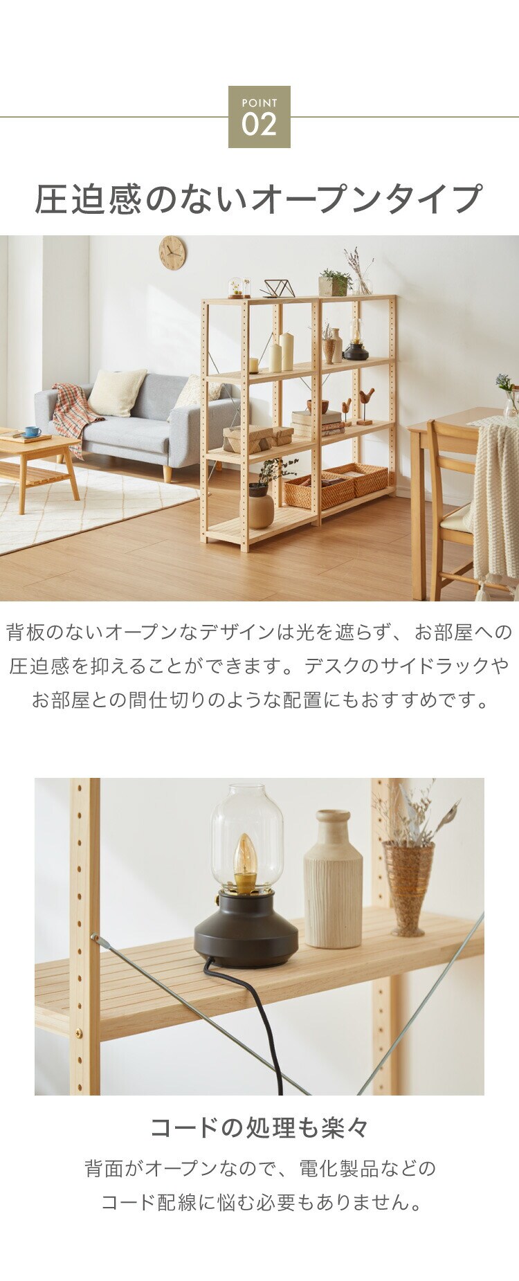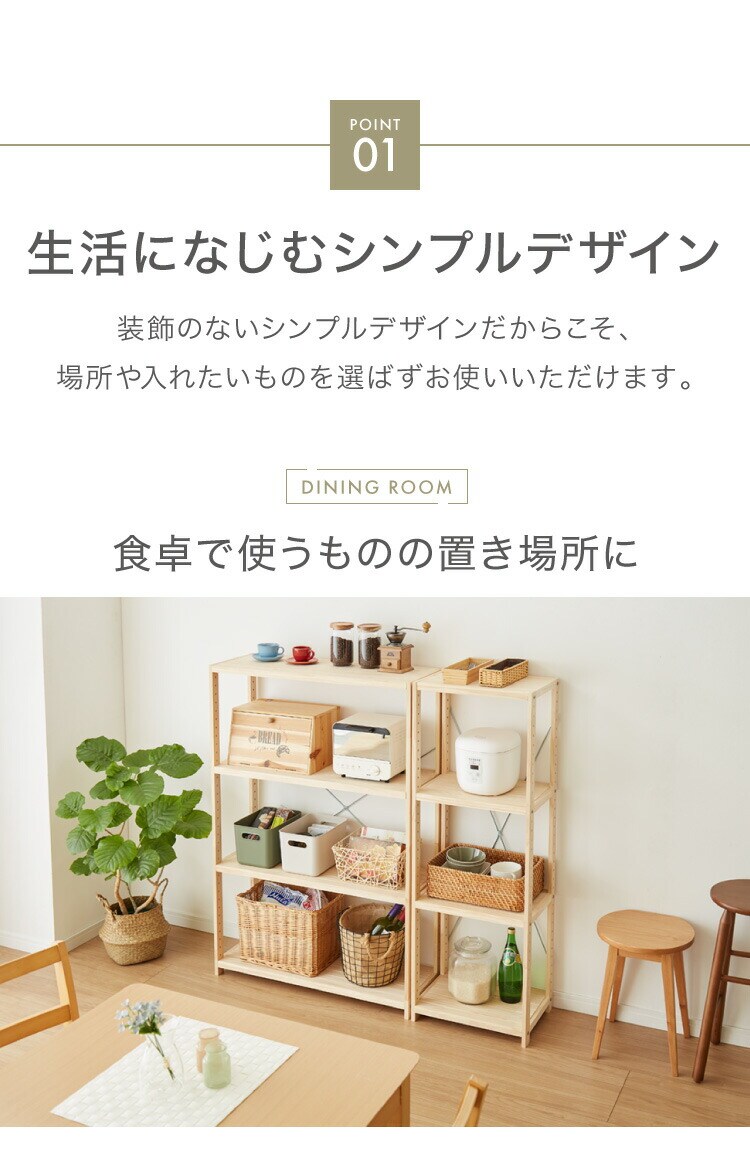 木目調の棚板がおしゃれなオープンラック。