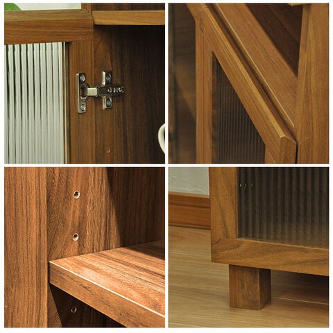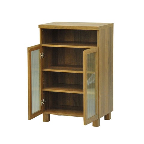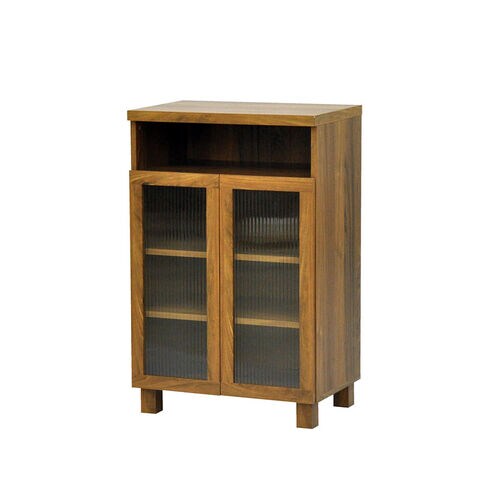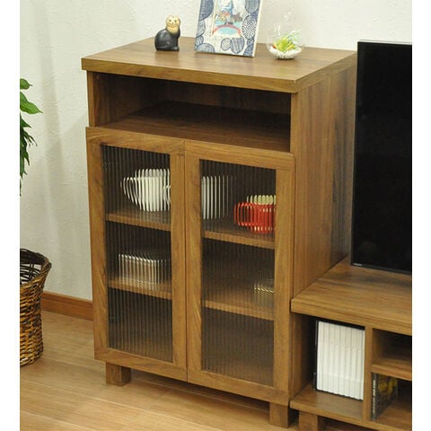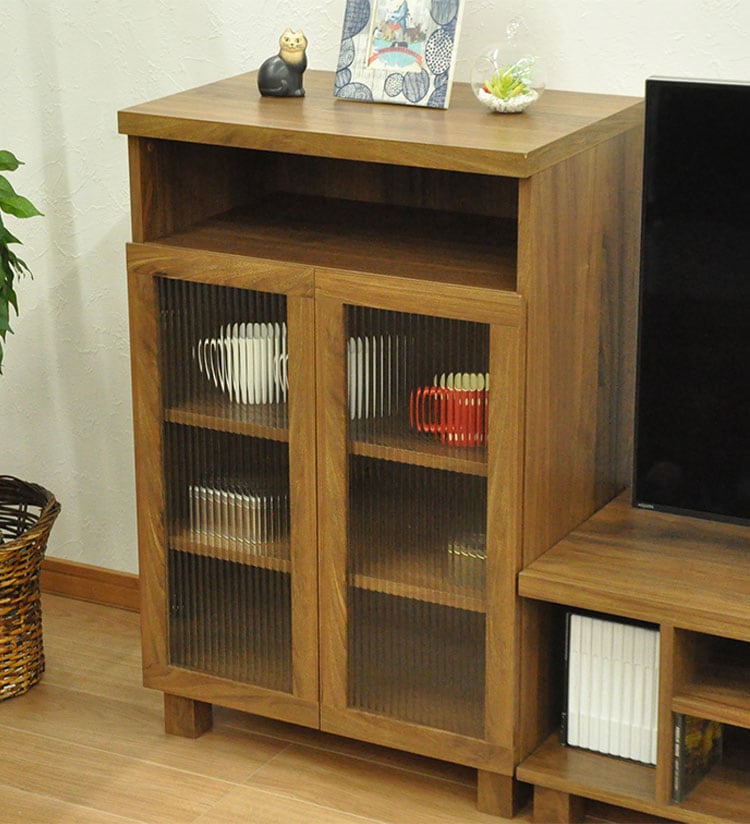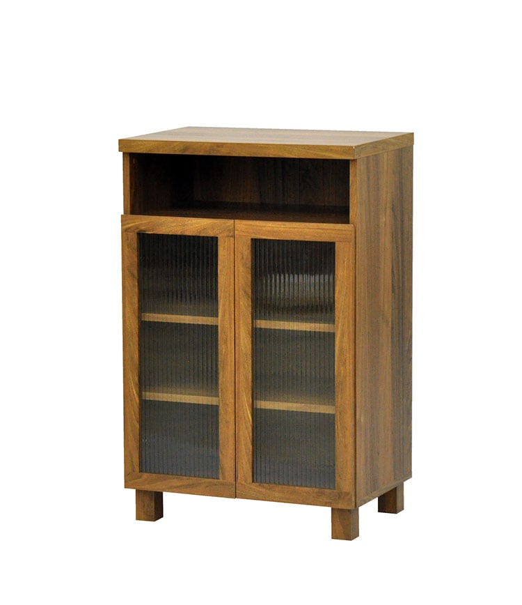 配線孔が付いたオープン棚と、モールガラスを使った開き戸がレトロな雰囲気のガラスキャビネットです。