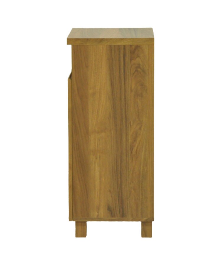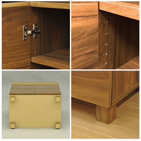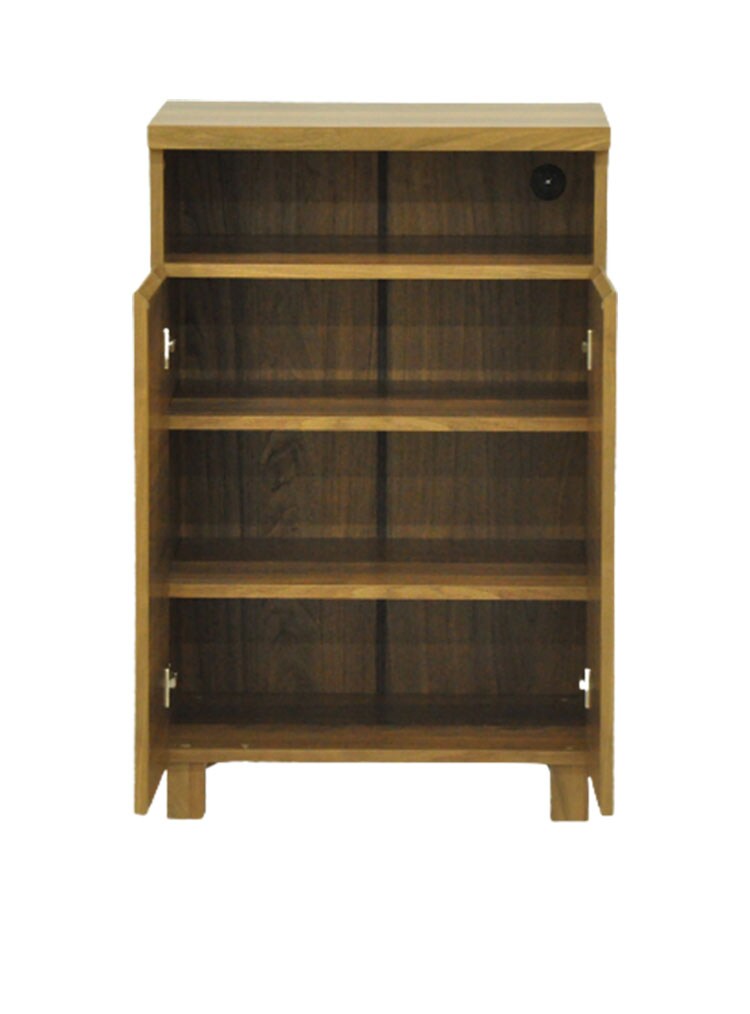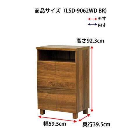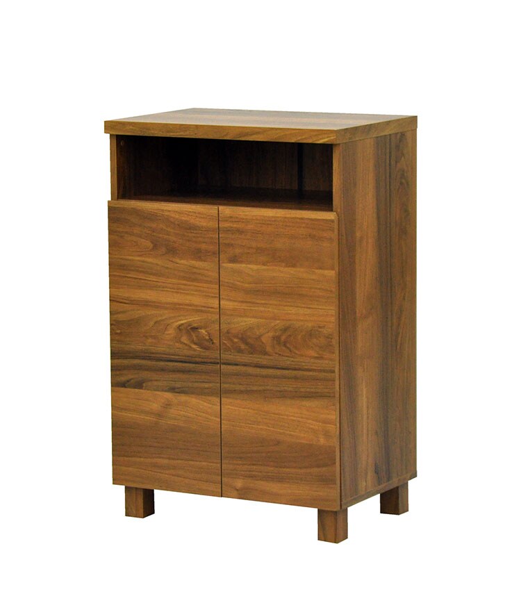 配線孔が付いたオープン棚と、ウォールナット色の木目が美しい開き戸タイプのキャビネットです。