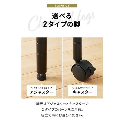 アジャスターとキャスターが両方付属され、幅広い用途に御使用いただけます。