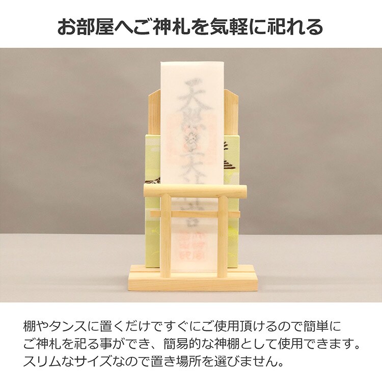 こちらの御札立ては棚やタンスに置くだけですぐにご使用頂けるので簡単にご神札を祀る事ができ、簡易的な神棚として使用できます。