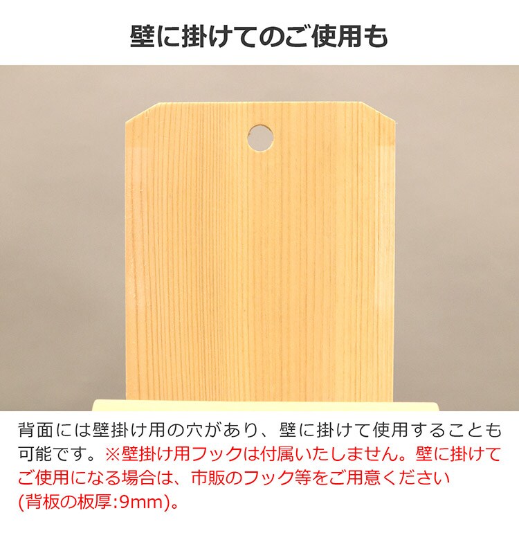 壁掛け用の穴はありますが、当商品は壁掛け用フックは付属いたしません。壁に掛けてご使用になる場合は、市販のフック等をご用意ください(背板の板厚:3mm)。