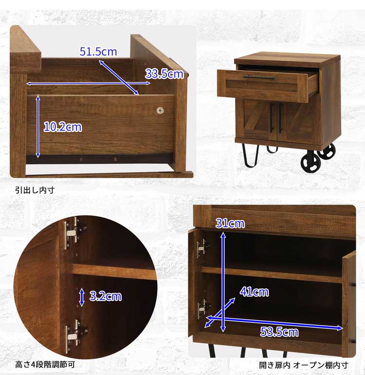 ・引出し内寸(約):幅51.5×奥行33.5×高さ10.2(14.5)cm、扉内内寸(約):幅53.5×奥行41×高さ31cm※()は有効高さ