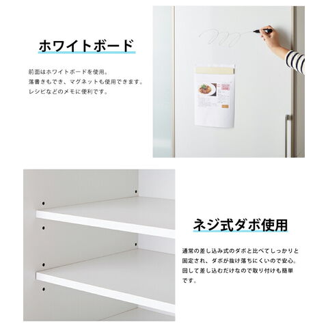 ・前面はホワイトボード仕様なのでメモ代わりにもなり、また中の収納物が見えないのでキッチンまわりをすっきりさせてくれます。
