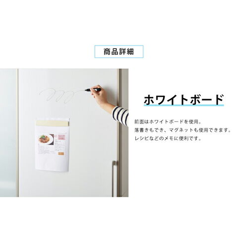 ・前面はホワイトボード仕様なのでメモ代わりにもなり、また中の収納物が見えないのでキッチンまわりをすっきりさせてくれます。