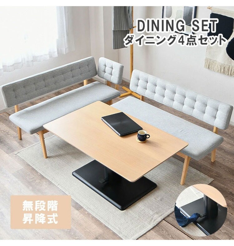 ダイニングセット 4点セット 昇降テーブル ベンチ サイドアーム 昇降式テーブル 高さ調整 長方形 ダイニングテーブルセット 4人用 ベンチ 長椅子 サイドアーム付き カフェテーブル 2脚セット シンプル【送料無料】
