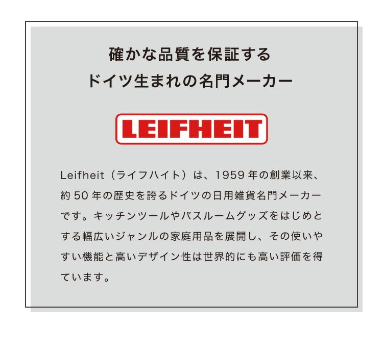 Leifheit(ライフハイト)の製品は、1959年の創業以来、使いやすい機能を備え、高いデザイン性を持った、革新的な家庭用品です。Leifheit(ライフハイト)は家庭用品販売のメーカーとして、ヨーロッパで主要なメーカーの一つで、キッチンツールやバスルームグッズ、脚立やアイロン台などの幅広い品揃えと高品質の商品で、世界的にも高い評価を得ています。