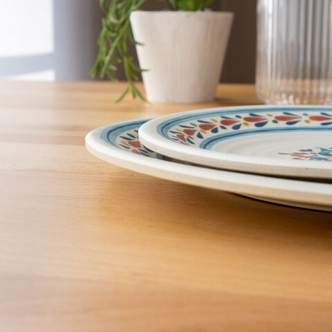 メラミン食器は「メラミン樹脂」というプラスチックを素材とした食器です。食器の日常使いに非常に適しており、軽くて丈夫、割れにくくて汚れが落としやすいです。メラミンは熱いものを入れても熱伝導率が低いので、熱々の料理を入れても食器自体が熱くなりにくく、持ちやすいです。また、他のプラスチック樹脂よりも硬度が高いため、食器に傷がつきにくく長く使用いただけます。