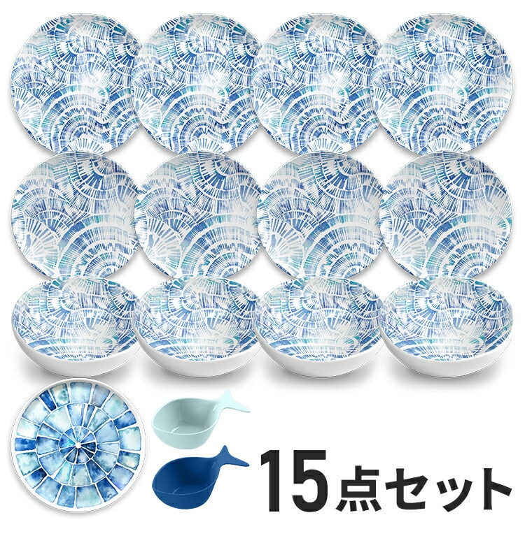 コースタルスカロップ 15点セット メラミン食器 割れにくい おしゃれ 食洗機対応 ボウル お皿 深皿 可愛い 電子レンジ不可 食洗機対応 食器セット プレート【送料無料】