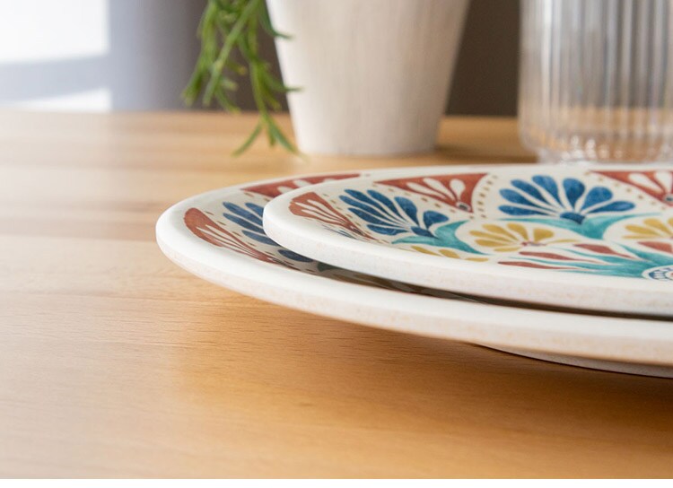 メラミン食器は「メラミン樹脂」というプラスチックを素材とした食器です。食器の日常使いに非常に適しており、軽くて丈夫、割れにくくて汚れが落としやすいです。メラミンは熱いものを入れても熱伝導率が低いので、熱々の料理を入れても食器自体が熱くなりにくく、持ちやすいです。また、他のプラスチック樹脂よりも硬度が高いため、食器に傷がつきにくく長く使用いただけます。