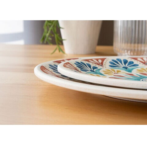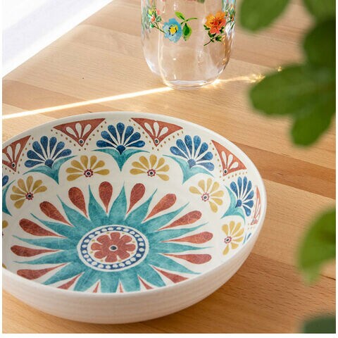 ハンドメイド風で南欧デザインが特徴のメラミン食器です。自然のモチーフをパッチワークのように組み合わせたユーモラスなデザインです