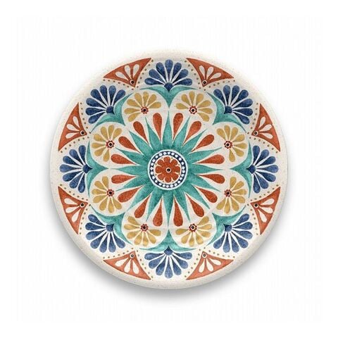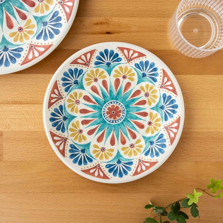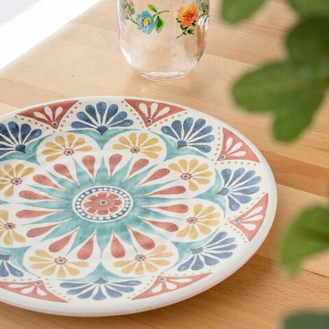 ハンドメイド風で南欧デザインが特徴のメラミン食器です。自然のモチーフをパッチワークのように組み合わせたユーモラスなデザインです