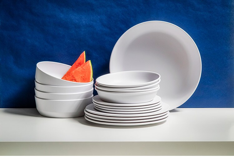 メラミン食器は「メラミン樹脂」というプラスチックを素材とした食器です。食器の日常使いに非常に適しており、軽くて丈夫、割れにくくて汚れが落としやすいです。メラミンは熱いものを入れても熱伝導率が低いので、熱々の料理を入れても食器自体が熱くなりにくく、持ちやすいです。また、他のプラスチック樹脂よりも硬度が高いため、食器に傷がつきにくく長く使用いただけます。