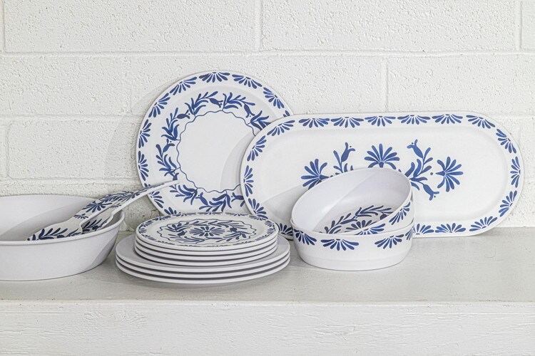 ホワイトベースにブルーのプラントデザインが特徴のメラミン食器です。青磁をイメージしたヨーロッパスタンダードデザインです