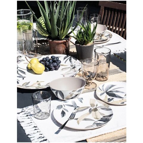 BALI LEAVES(バリ・リーブス) は、自然な色合いの影のある葉が、ナチュラルなテーブルセッティングを演出するバリテイストな葉模様。耐久性に優れたバンブーメラミンで、プランタやリトリート・ポタリーとの組み合わせも可能です