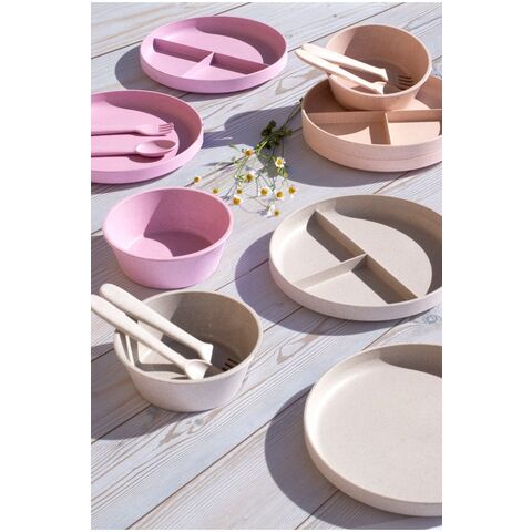 小振りなデザインが特徴で、アウトドアやお子さまにお使いいただけます。マットな質感、ナチュラルテイストデザインで、麦わらを素材にしているPP食器です。3つ切り構造ですので、ワンプレートでお食事をお楽しみいただけます。底面にシリコンが配置されているので、テーブルでも滑りにくいのが特徴です