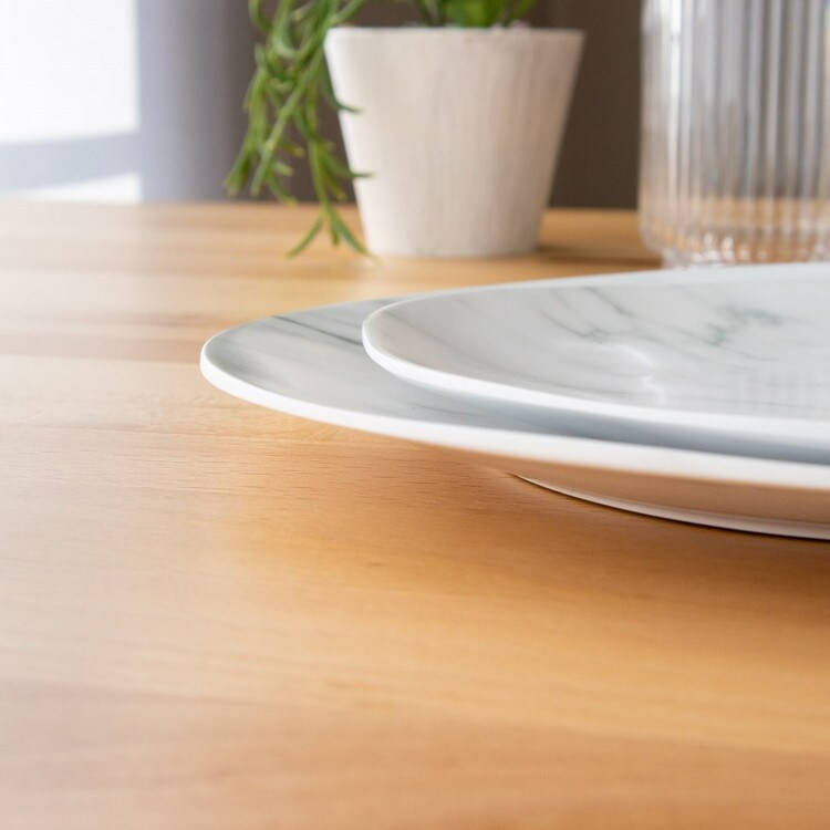 メラミン食器は「メラミン樹脂」というプラスチックを素材とした食器です。食器の日常使いに非常に適しており、軽くて丈夫、割れにくくて汚れが落としやすいです。メラミンは熱いものを入れても熱伝導率が低いので、熱々の料理を入れても食器自体が熱くなりにくく、持ちやすいです。また、他のプラスチック樹脂よりも硬度が高いため、食器に傷がつきにくく長く使用いただけます。