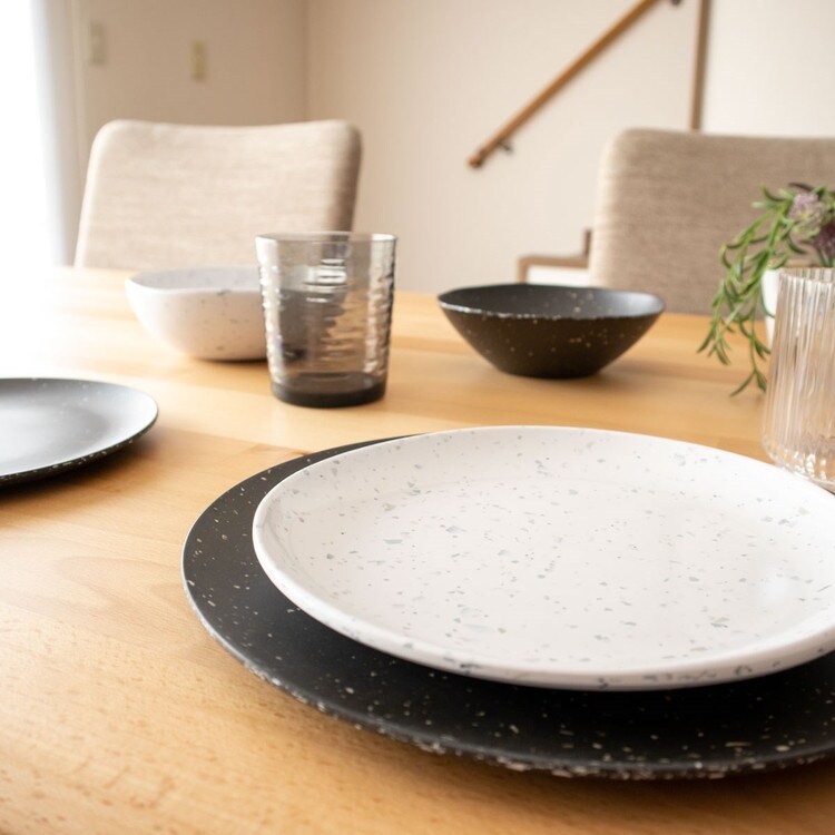 自然な斑点が有る磁器の風合いを模したシックなメラミン食器です
